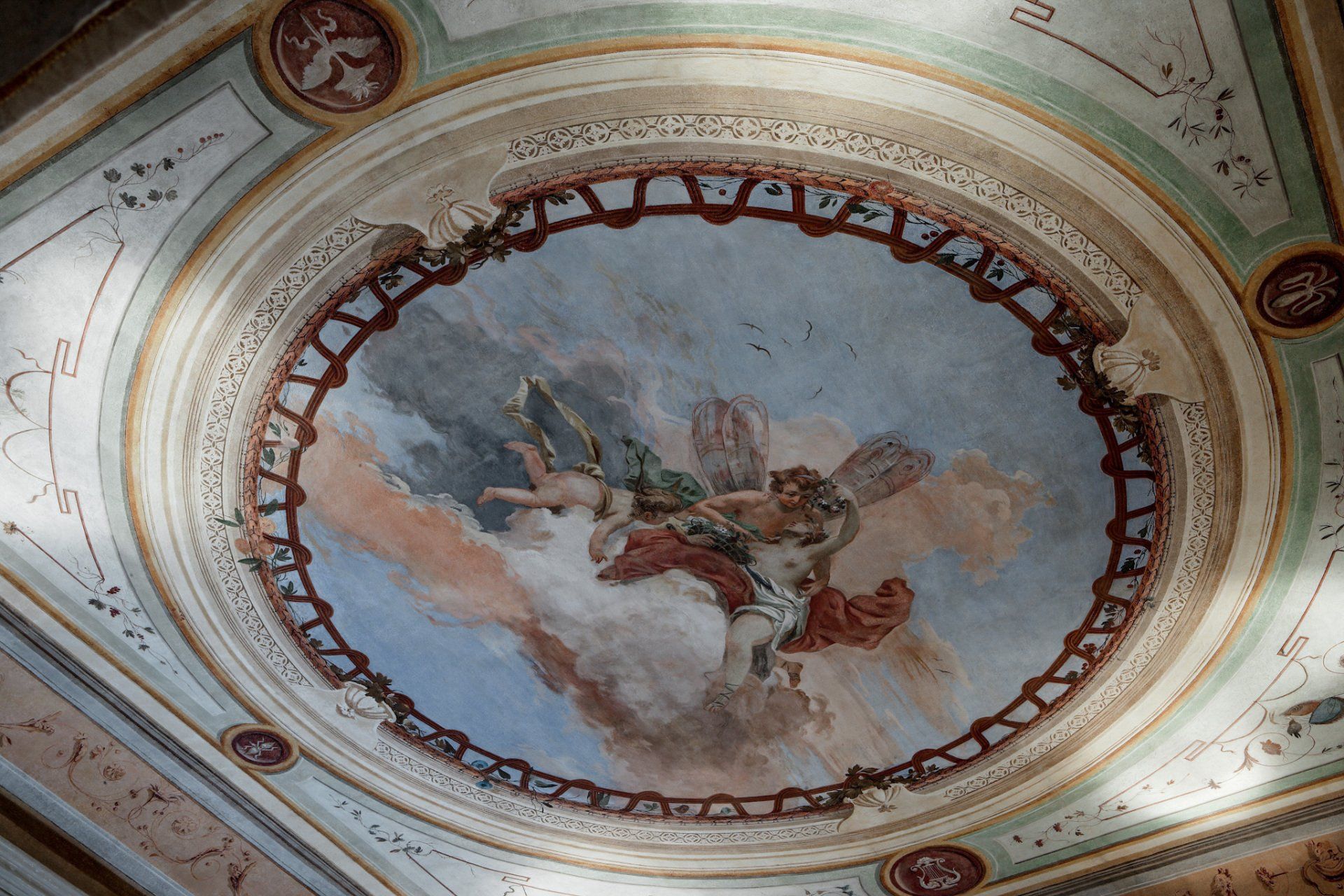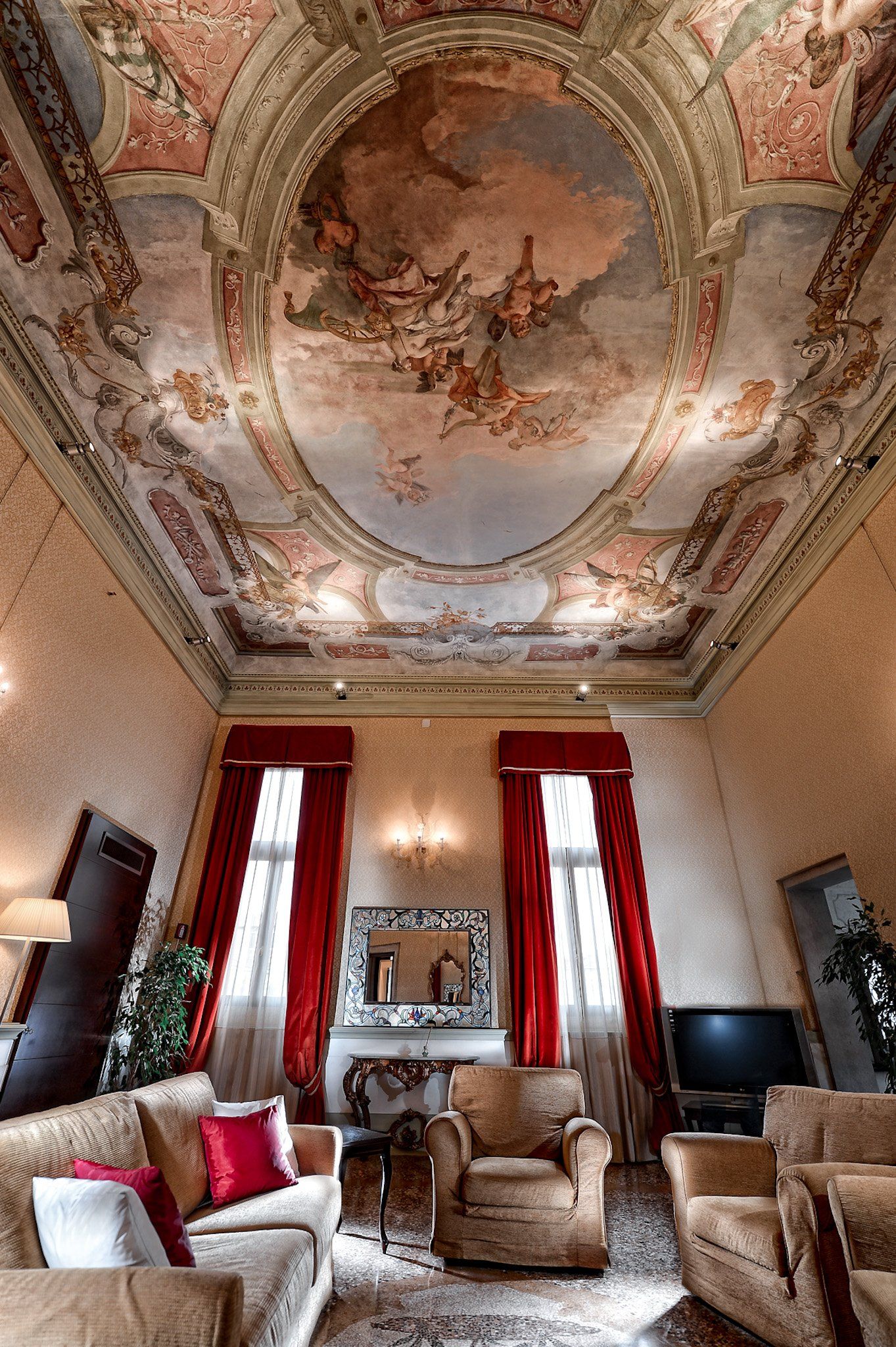 Die im Zeichen der Kunst geborene und von ihr durchdrungene Royal Suite trägt ihren Namen nicht zufällig: Die Fresken von Lazzarini (Meister von keinem Geringeren als Giambattista Tiepolo, dem berühmten venezianischen Maler des 18. Jahrhunderts) stechen ins Auge. Ein Trompe-l'œil-Effekt in voller Pracht: In der Decke des Ruzzini-Palastes scheint sich ein himmlisches Gewölbe zu öffnen, das den Blick auf Figuren aus der griechischen Mythologie freigibt.